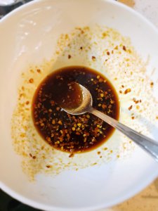 - While waiting, combine all the sauce ingredients in a bowl and set aside1 tbsp sesame oil, 1 tbsp corn starch, 2 tbsp hoisin sauce, 1/4 tsp red pepper flakes, 1 tsp sugar, 1 tbsp soy sauce